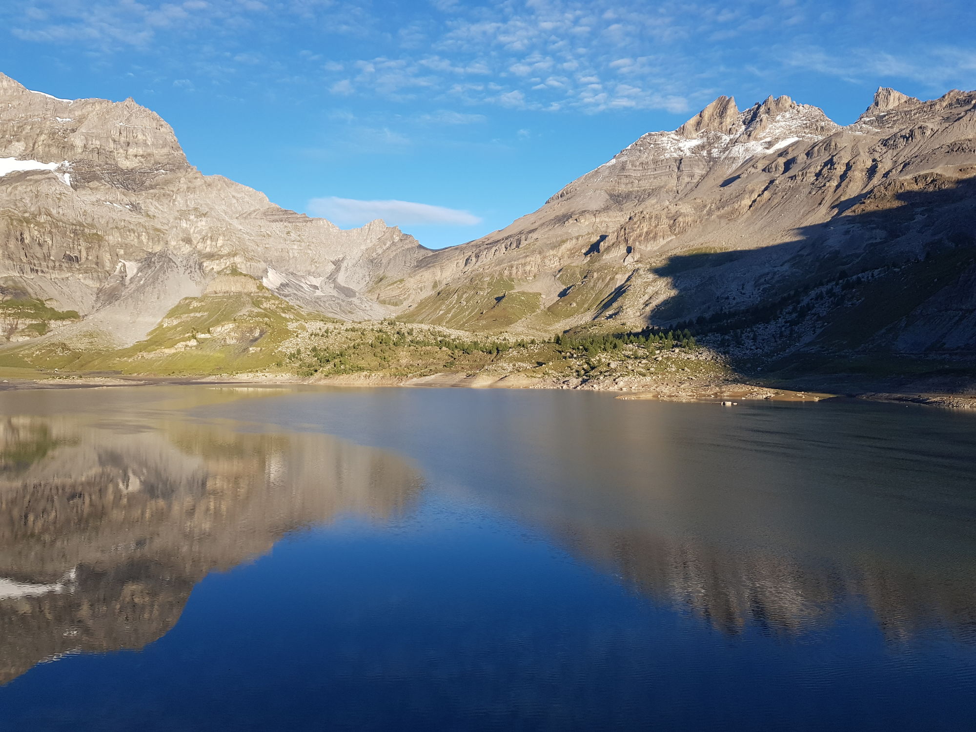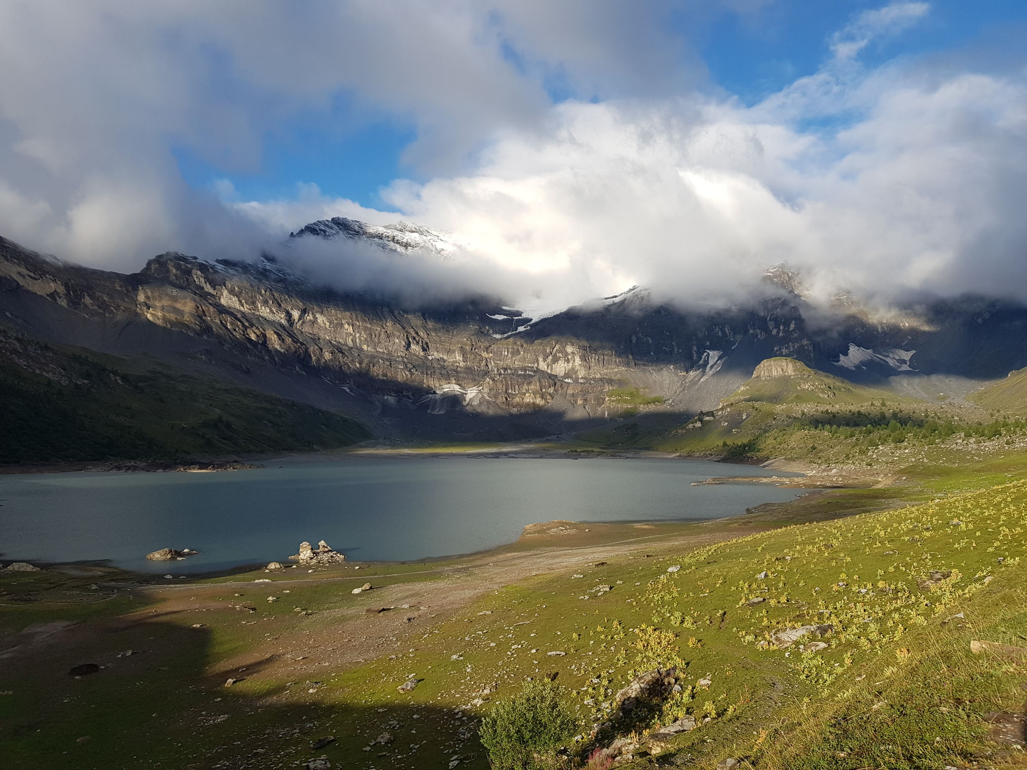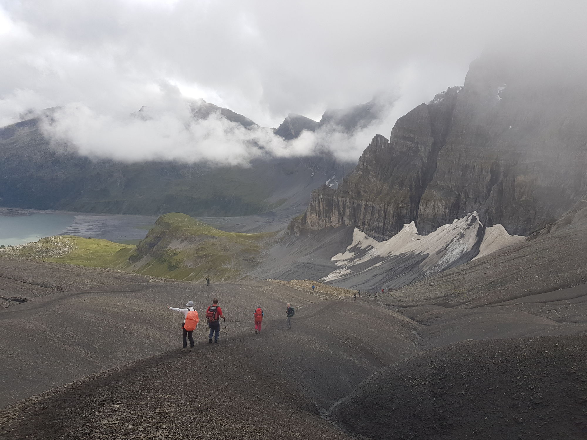 Am Samstag starteten wir um 8 in Richtung Col de Susanfe. Unser Ziel war die Haute Cime (3257m), der höchsten Gipfel der Dents du Midi. In der Nacht hatte es auf den Bergen geschneit, und der Neuschnee glitzerte in der Sonne unter den teils noch wolkenverhangenen Gipfeln. Wir starteten bei Sonnenschein, vorbei an weidenden Kühen am Lac de Salanfe. Als wir zum Col de Susanfe hinaufstiegen, zog es zu und fing an zu nieseln. Wir erreichten den Sattel knapp unter einer nunmehr geschlossenen Wolkendecke. Anstatt den Gipfel im Nebel zu erklimmen, stiegen wir zur Cabane de Susanfe hinab, wo wir in der Wärme eine feine Gemüsesuppe geniessen konnten. Dann ging es wieder hinauf zum Pass. Da die Berge immer noch in den Wolken waren, verschoben wir den Gipfel auf nächstes Jahr und stiegen wieder hinab zum See. Inzwischen war die Sonne herausgekommen, und das erfrischende Bad im See war wunderbar.