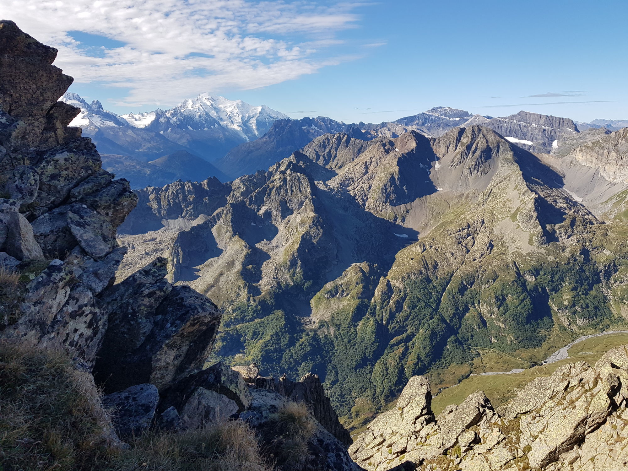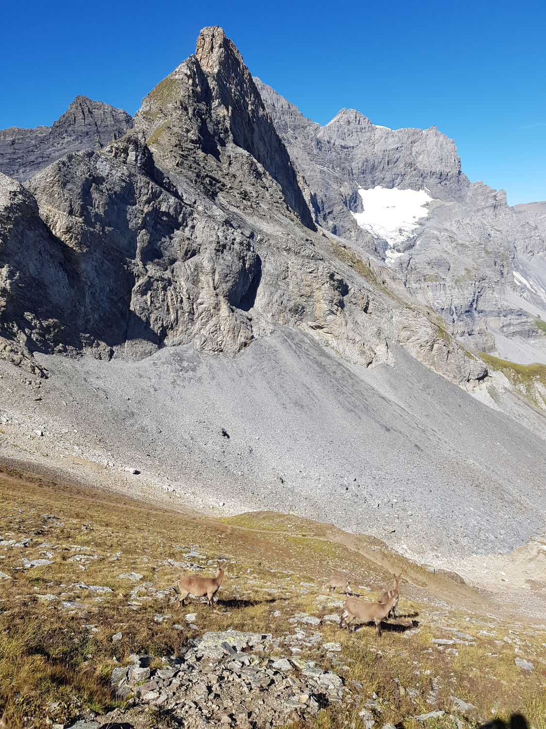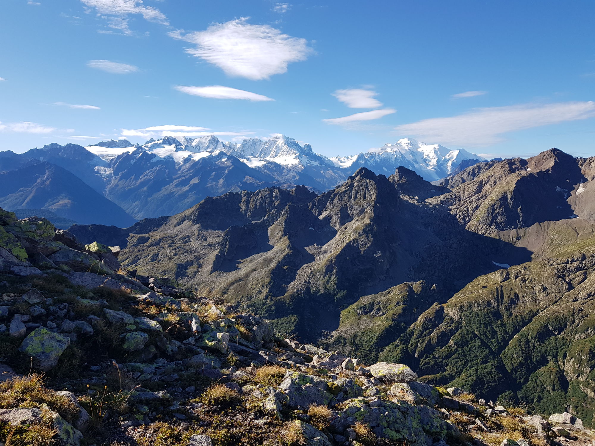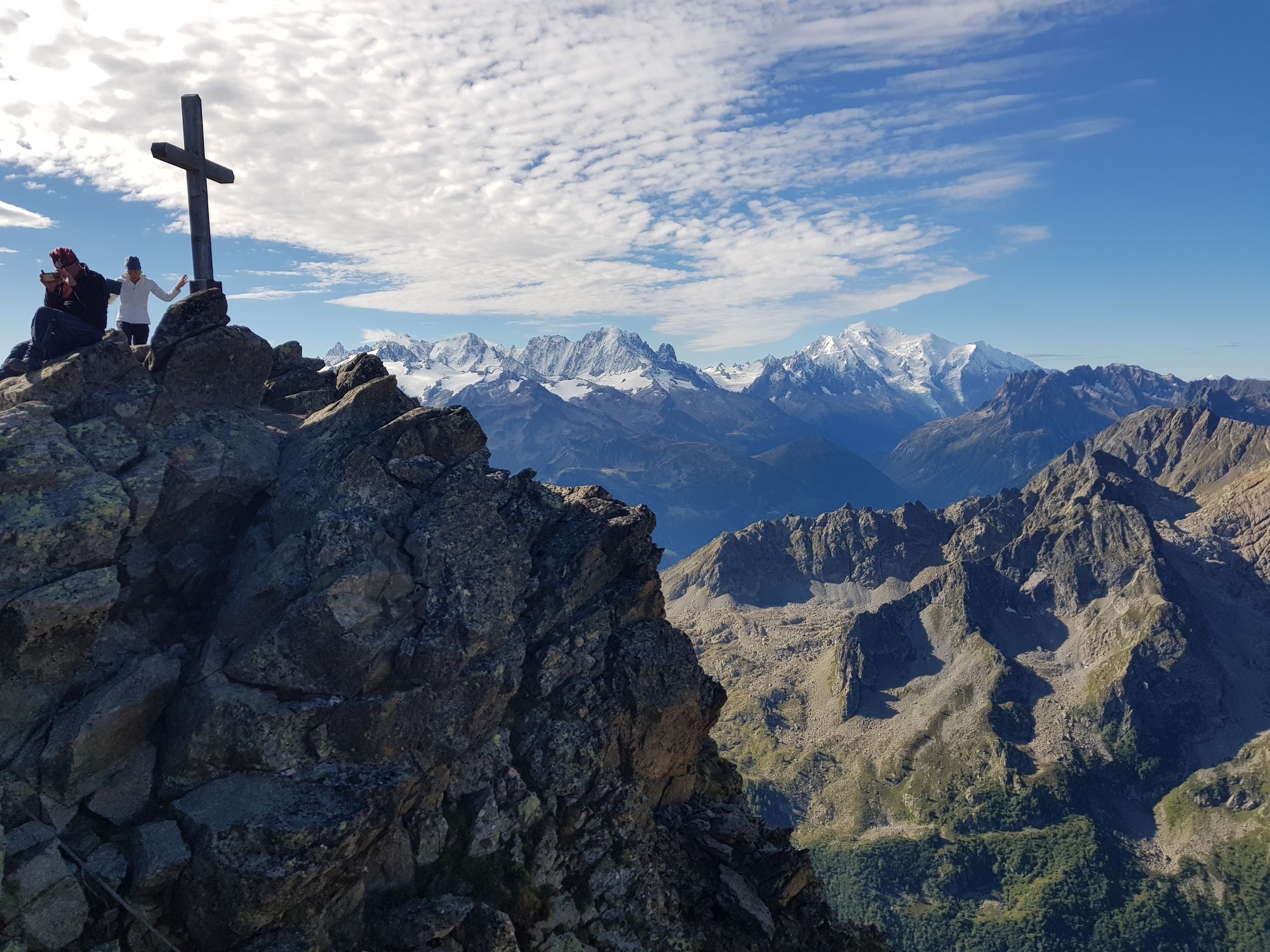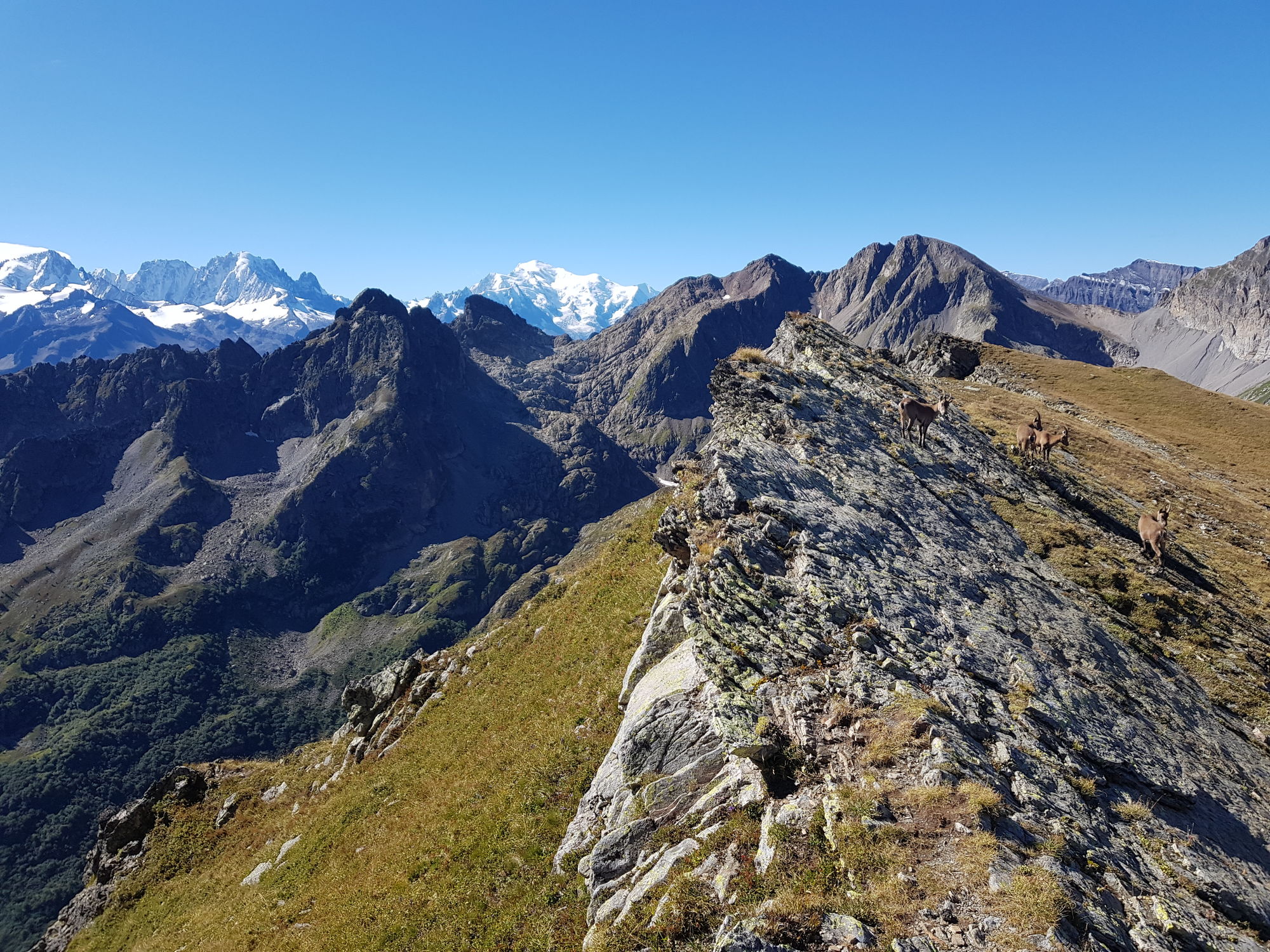 Am Sonntagmorgen begrüsste uns die Sonne bei fast wolkenlosem Himmel. Die Berggipfel spiegelten sich im See. Wir starteten um halb 8 in Richtung Col d'Emaney. Von dort genossen wir einen wunderbaren Blick auf den Mont Blanc und die Grandes Jorasses. Wir stiegen weiter den Grat entlang zum Le Luisin (2786m) auf; unterwegs sahen wir immer wieder Steinböcke und Steingeissen mit Jungtieren. Vom Gipfel hatten wir einen grandiosen Blick über Grand Combin, Matterhorn, Weisshorn bis zu den Gipfeln der Berner Alpen. Zurück am Sattel stiegen wir nach kurzer Rast zur Alp Emaney ab, unterwegs mit kühlem Bad im Bergbach. Weiter ging es über Alpweiden und durch Wälder hinab nach Finhaut, von wo wir die Heimreise antraten.