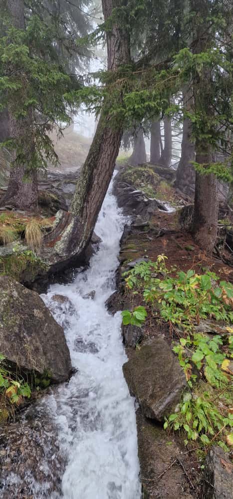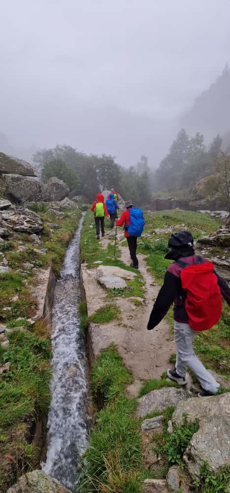 Nach der Ankunft in Mund gab Daniel erste Erläuterungen zum Safrananbau in Mund, einem von drei Orten in der Schweiz, wo die spezielle Krokusart zur Safrangewinnung kultiviert wird, sowie zum Klima im Wallis. Das Wallis sei eine der trockensten Gegenden in Mitteleuropa, daher gäbe es schon seit Jahrhunderten Bewässerungssysteme, um das kultivierte Land bewässern zu können. Von Trockenheit konnte an diesem Morgen allerdings keine Rede sein. Gleichwohl machten wir uns nach einem kurzen Dorfrundgang auf zur ersten Wasserleite (Suone), die Stiegwasser. Diese wird im Gredetschtal gespiesen und verläuft auf der Munder-Seite. Wir bewegten uns auf dem sogenannten Trätschbord neben der gegrabenen Wasserfuhre. Unterwegs gab Daniel immer wieder Wissen über dieses weltweit verbreitete Bewässerungssystem. Im Gredetschtal wechselten wir zur Birgischer Talseite und folgten der Oberschta, so der Name dieser Suone. Diese ist kühn angelegt. Wanderweg und Wasserleite führen heute durch zahlreiche Tunnels. An einer Stelle kann man aber noch gut erkennen, dass die ursprüngliche Wasserfuhre in den Felsen gemeisselt war. Daniel berichtete auch über die Rechte des Wasserbezugs und wie das kostbare Nass auf die Felder und Matten kommt.