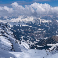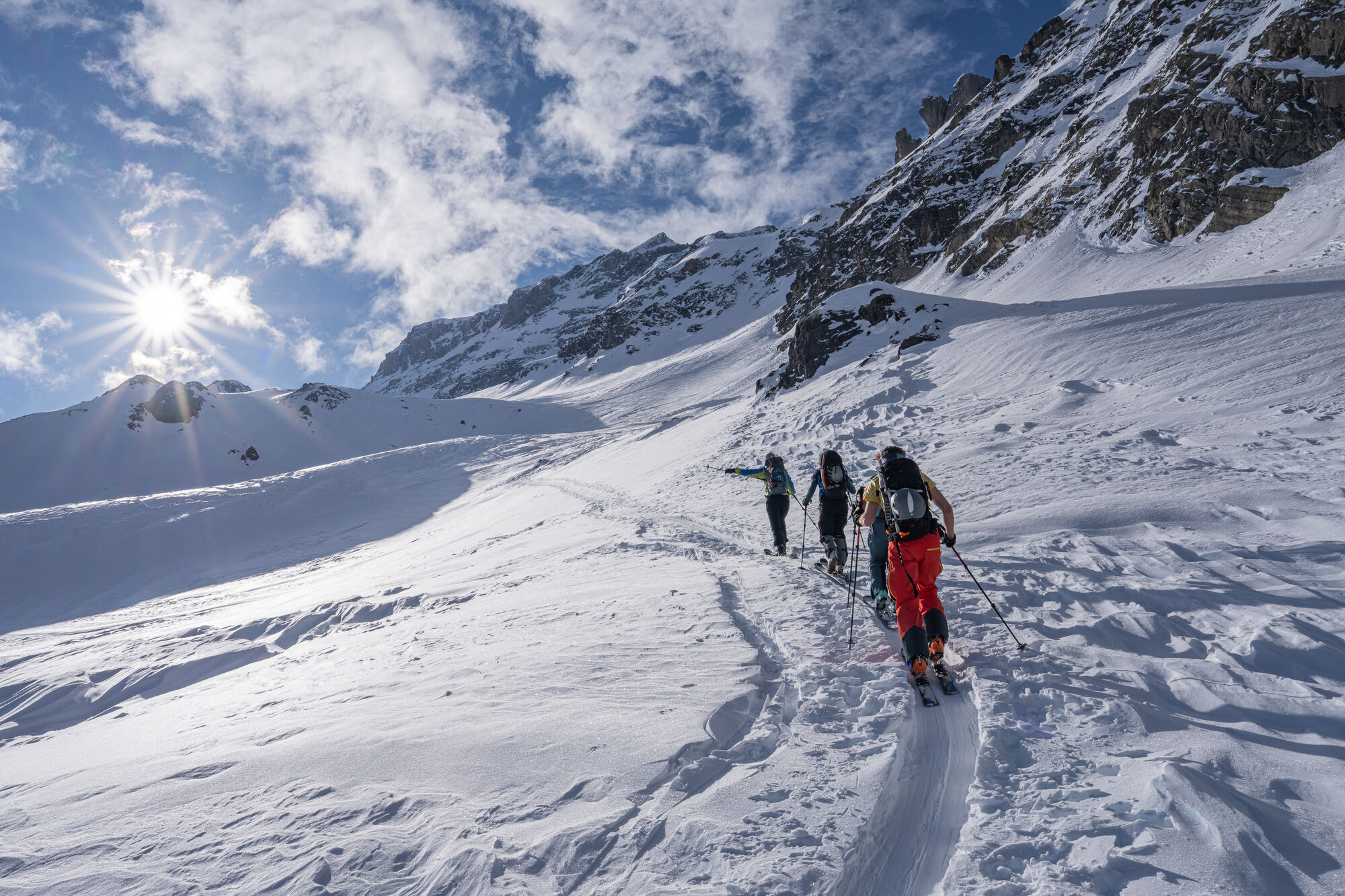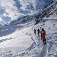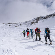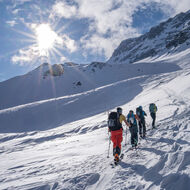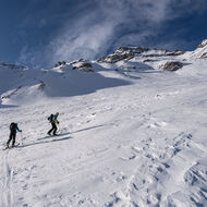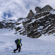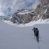 Über Schönbüel stiegen wir bei idealen Bedingungen stetig höher, dem Frühstücksplatz entgegen. Kurz davor wartete noch eine knifflige Passage. Unterhalb einer mächtigen Wächte galt es eine steile Stufe zu überwinden. Ski auf den Rucksack, Steigeisen an – konzentriert meisterten wir auch dieses Hindernis.
