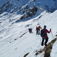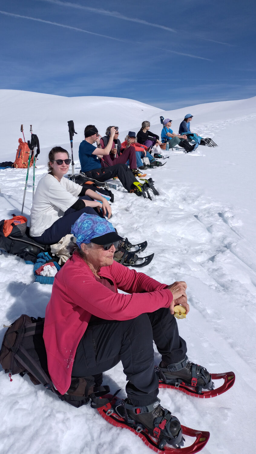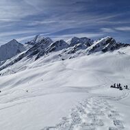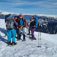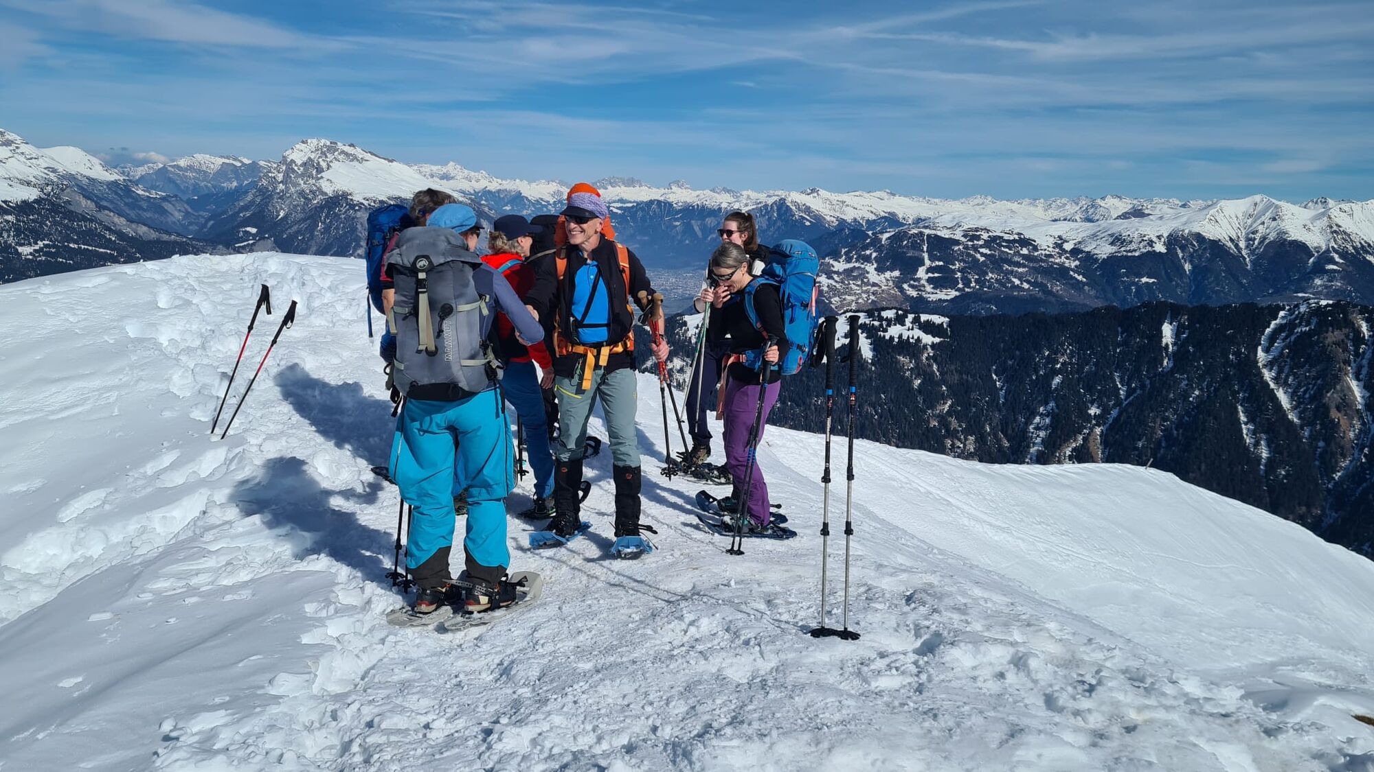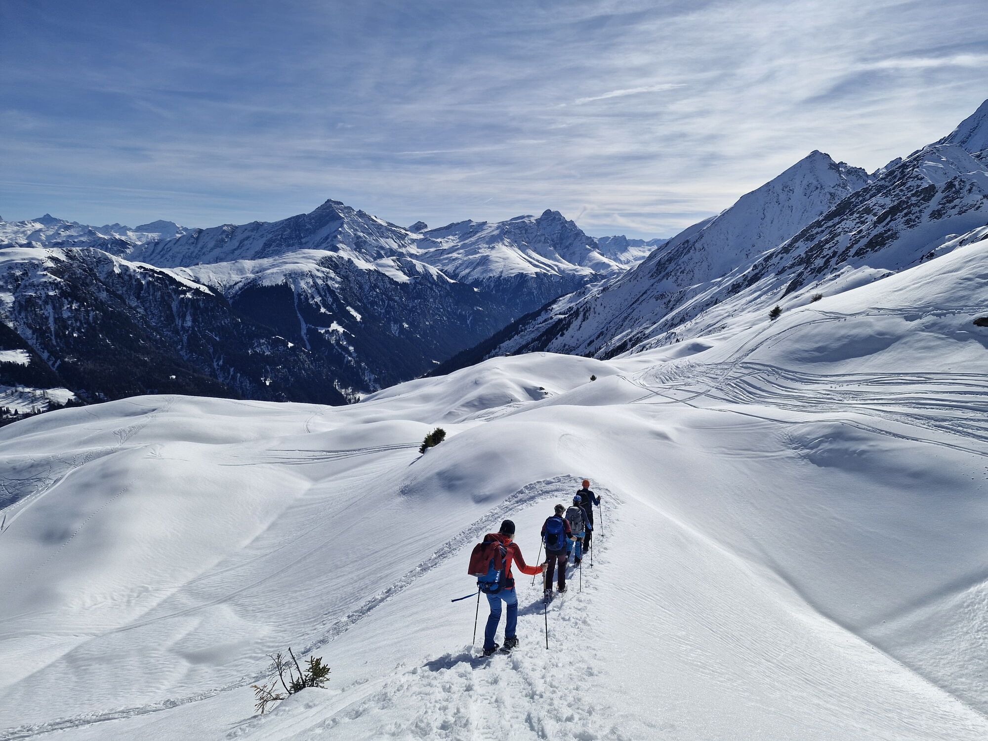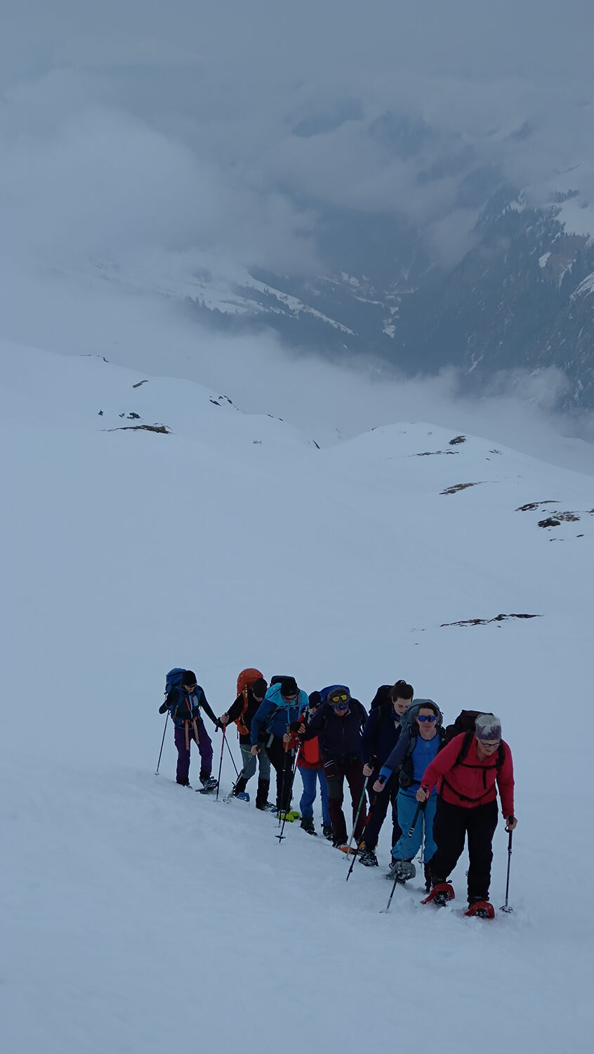 Die Anreise mit ÖV von Aarau ist recht unspektakulär, bis es dann nach Bonaduz losgeht. Der Zug der Rhätischen Bahn windet sich durch die einmalige Rheinschlucht, den wir am Umsteigepunkt in Versam-Safien verlassen. Im gut besetzten Postauto geht es die enge und kurvenreiche Strasse hoch bis zum Eingang ins Safiental. Auch die Fortsetzung bis Tenna ist spannend. Dort machen wir uns bei Sonnenschein zum Schlüechtli auf. Aufgrund des warmen Wetters ist der Schnee weich. Aber es gibt eine gute Trasse hoch zum Stellisee, wo wir unser Mittagessen bei toller Aussicht in die Bündner Alpen geniessen. Weiter geht es noch einmal steil hoch zum Gipfel. Dort ist die Rundumsicht atemberaubend. Nachdem sich alle satt gesehen haben, machen wir uns auf den Rückweg nach Tenna auf, wo wir vor der Weiterreise nach Safien Platz genug Zeit haben, uns ein Zvieri zu gemehmigen und die Kirche zu besichtigen.