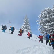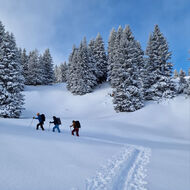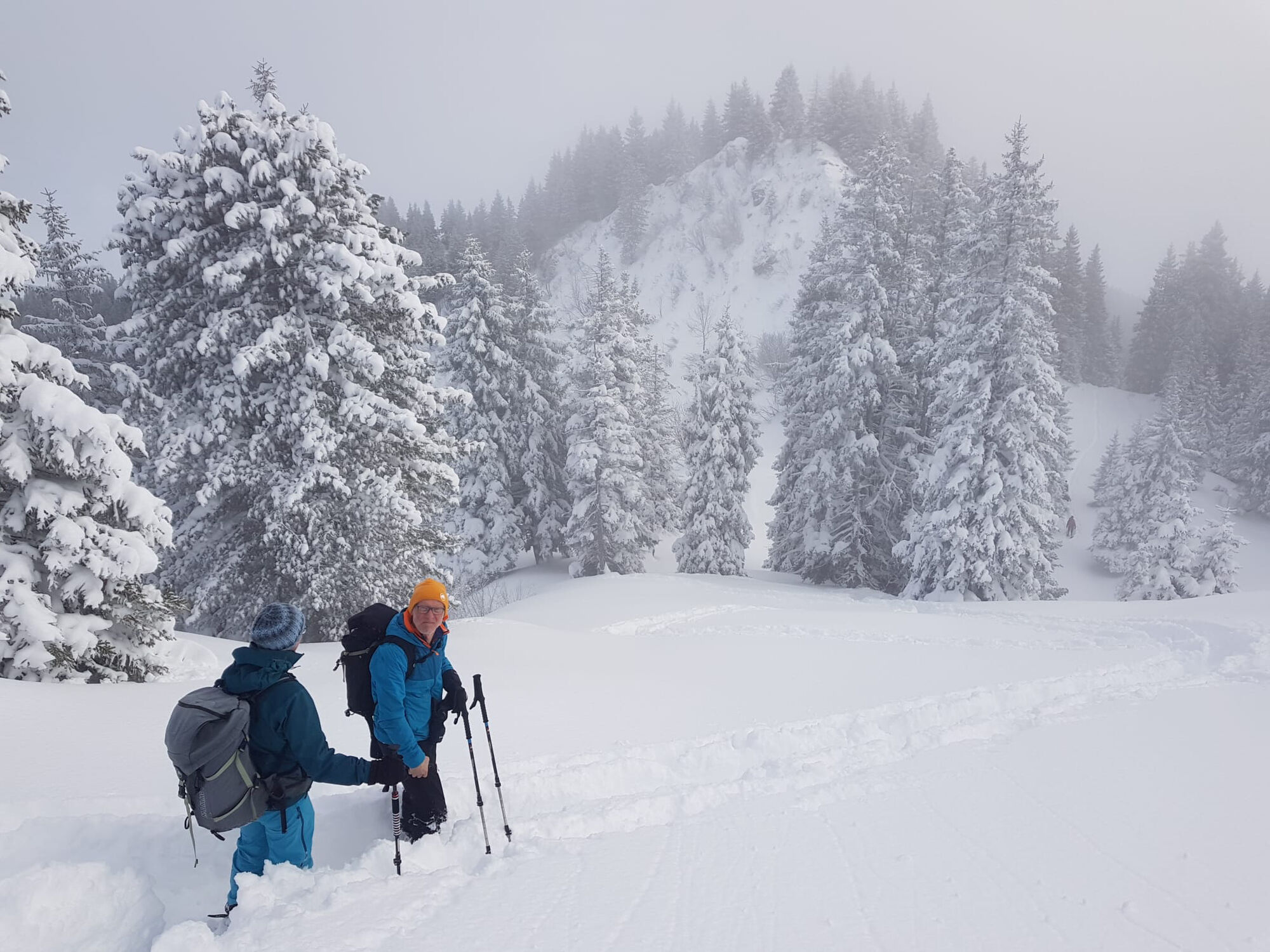 Eine stattliche Gruppe machte sich am Sonntagfrüh auf den Weg nach Langis auf. Wie oft war der Zug ab Luzern Richtung Sarnen gut besetzt. Auch im Postauto waren wir nicht alleine. Bei nebligem und kühlen Wetter machten wir uns zum Abstieg zur Ochsenalp auf, um dann via Münchenboden zum Mettlenbüel aufzusteigen. Vor uns waren einige Skitourenläufer unterwegs, welche im Neuschnee eine praktische Spur legten. Trotzdem kam es im letzten Abschnitt immer wieder zu Einbrüchen im weichen Untergrund. Unterdessen zeigte sich zeitweise die Sonne, zum guten Glück auch während der Mittagsrast auf dem Selispitz. Zurück im Mettlenbüel zielte die Route Richtung Riedmattstock. Kein beliebtes Ziel für Skitourengänger. So war keine Spur in diese Richtung gelegt. Also mussten wir uns selber durch den teilweise ein Meter tiefen Neuschnee kämpfen. Kein Wunder handelten wir uns so einen Rückstand auf die Marschtabelle ein. So entschlossen wir uns, beim Gipfelkreuz des Riedmattstocks umzukehren und auf demselben Weg Richtung Startpunkt zurück zu marschieren und auf die Umrundung des Schiessplatzes zu verzichten. Der Abstieg zur Ochsenalp machte im weichen Neuschnee richtig Spass. Zurück im Langis hatten wir genügend Zeit, um ein Zvieri im Restaurant zu geniessen, bevor wir uns mit Postauto und Zug auf den Heimweg machten.