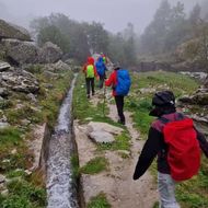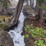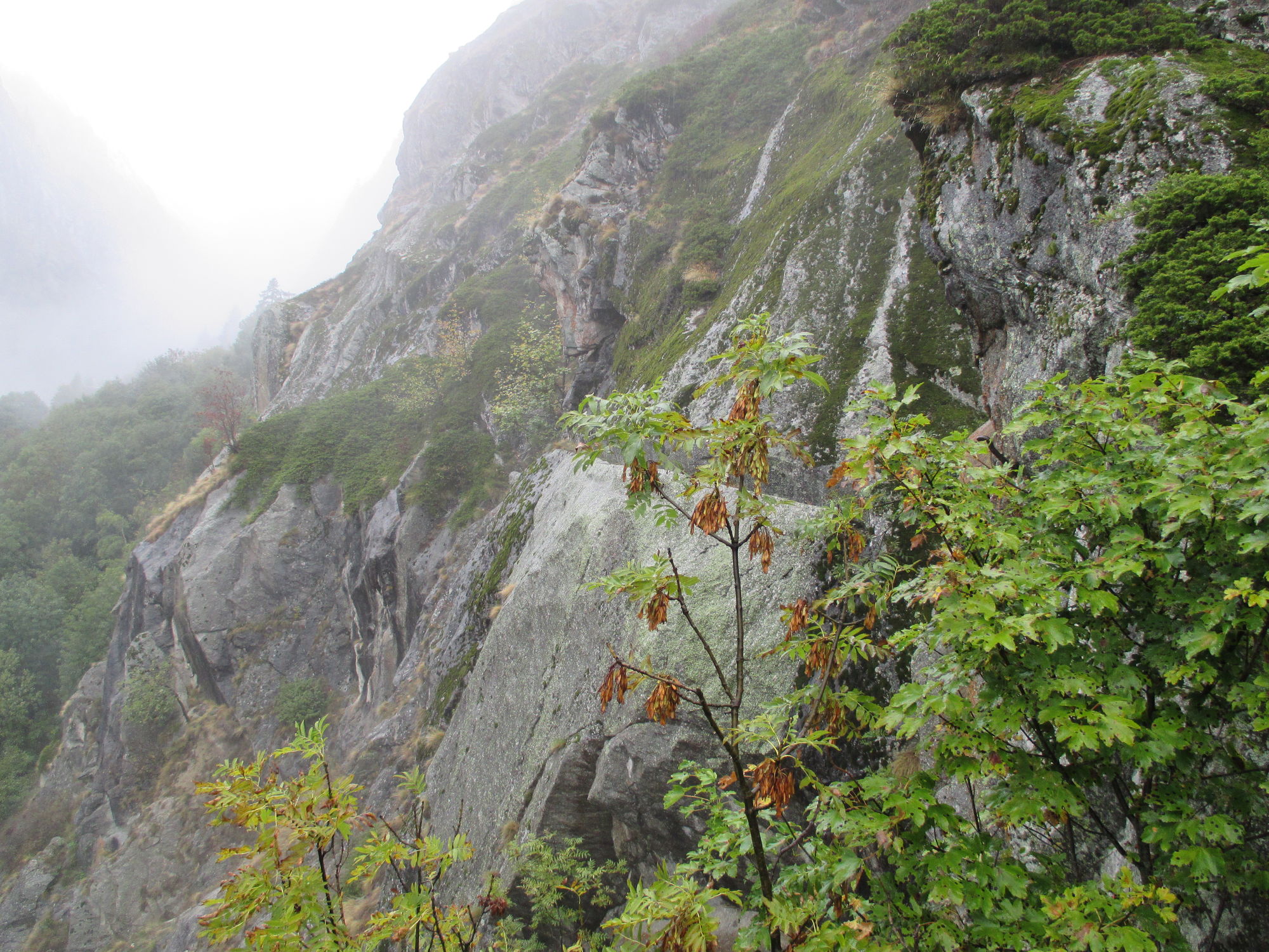 Nach der Ankunft in Mund gab Daniel erste Erläuterungen zum Safrananbau in Mund, einem von drei Orten in der Schweiz, wo die spezielle Krokusart zur Safrangewinnung kultiviert wird, sowie zum Klima im Wallis. Das Wallis sei eine der trockensten Gegenden in Mitteleuropa, daher gäbe es schon seit Jahrhunderten Bewässerungssysteme, um das kultivierte Land bewässern zu können. Von Trockenheit konnte an diesem Morgen allerdings keine Rede sein. Gleichwohl machten wir uns nach einem kurzen Dorfrundgang auf zur ersten Wasserleite (Suone), die Stiegwasser. Diese wird im Gredetschtal gespiesen und verläuft auf der Munder-Seite. Wir bewegten uns auf dem sogenannten Trätschbord neben der gegrabenen Wasserfuhre. Unterwegs gab Daniel immer wieder Wissen über dieses weltweit verbreitete Bewässerungssystem. Im Gredetschtal wechselten wir zur Birgischer Talseite und folgten der Oberschta, so der Name dieser Suone. Diese ist kühn angelegt. Wanderweg und Wasserleite führen heute durch zahlreiche Tunnels. An einer Stelle kann man aber noch gut erkennen, dass die ursprüngliche Wasserfuhre in den Felsen gemeisselt war. Daniel berichtete auch über die Rechte des Wasserbezugs und wie das kostbare Nass auf die Felder und Matten kommt.