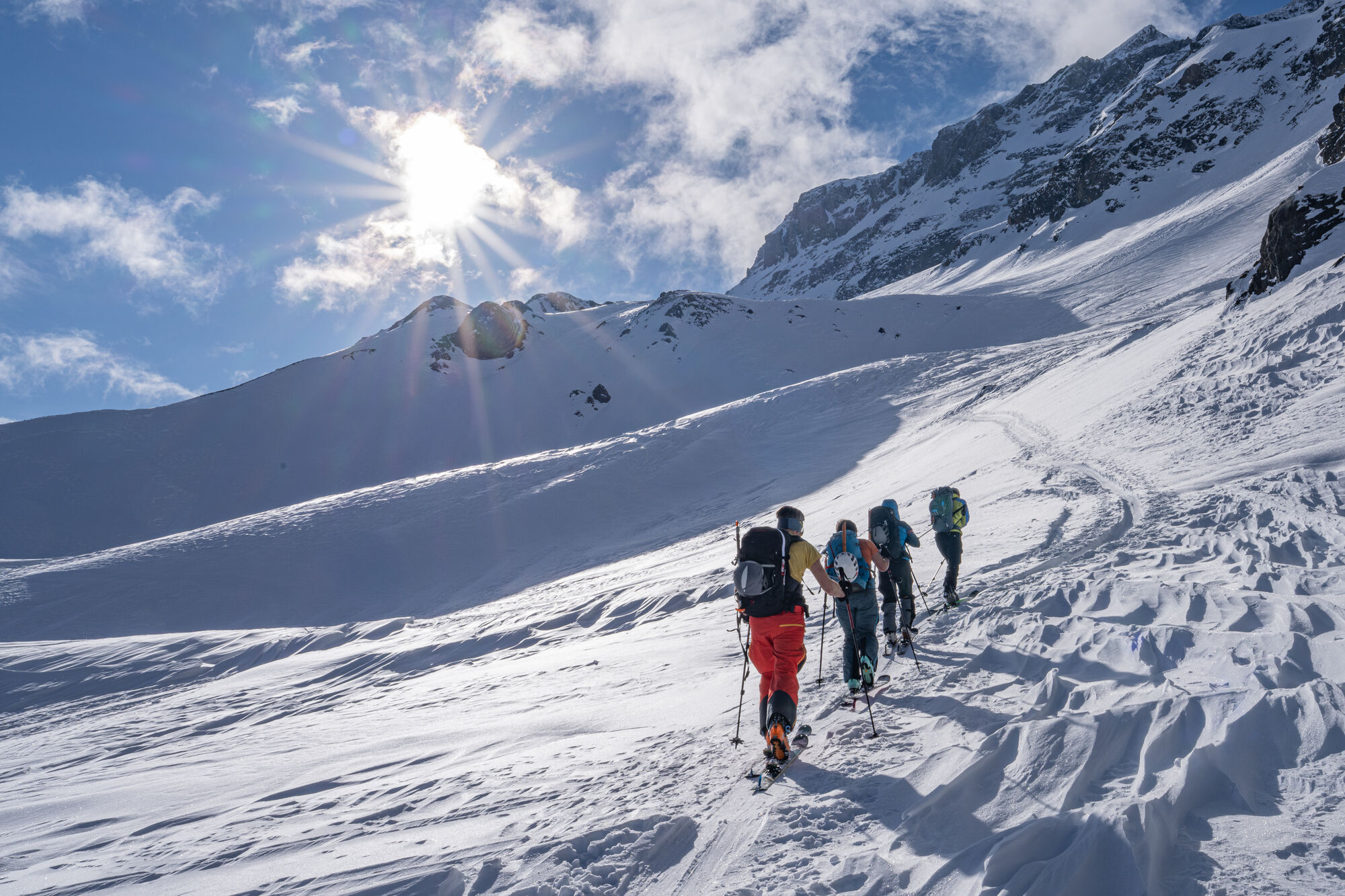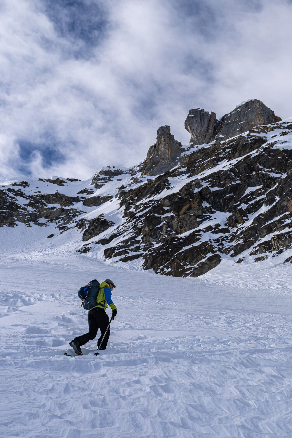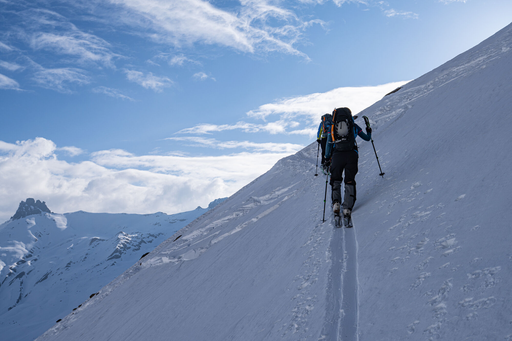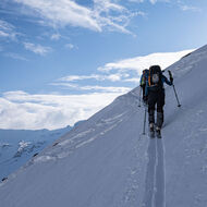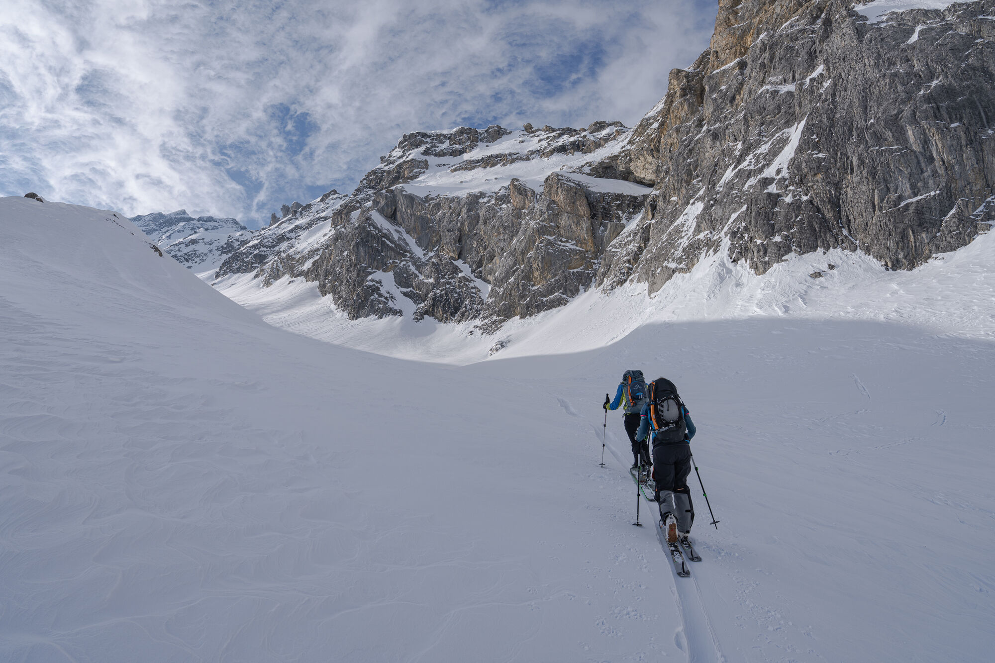 Über Schönbüel stiegen wir bei idealen Bedingungen stetig höher, dem Frühstücksplatz entgegen. Kurz davor wartete noch eine knifflige Passage. Unterhalb einer mächtigen Wächte galt es eine steile Stufe zu überwinden. Ski auf den Rucksack, Steigeisen an – konzentriert meisterten wir auch dieses Hindernis.