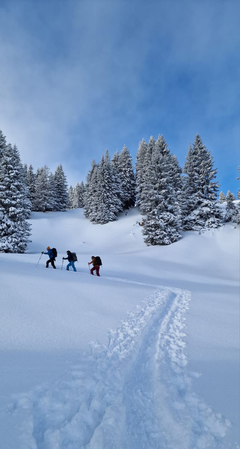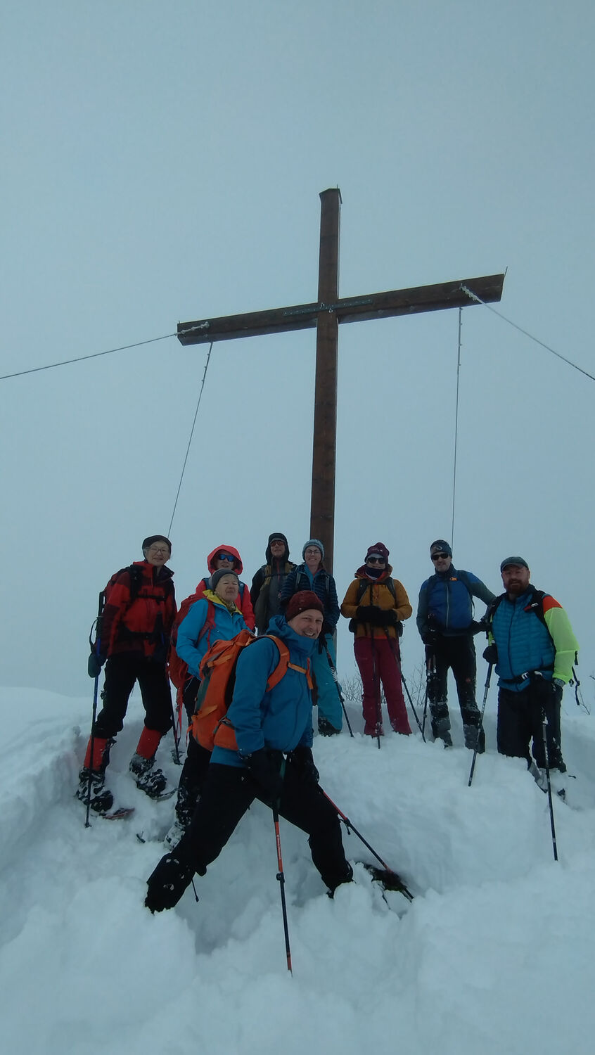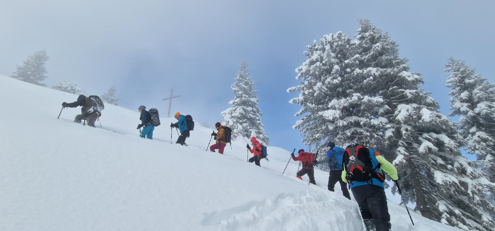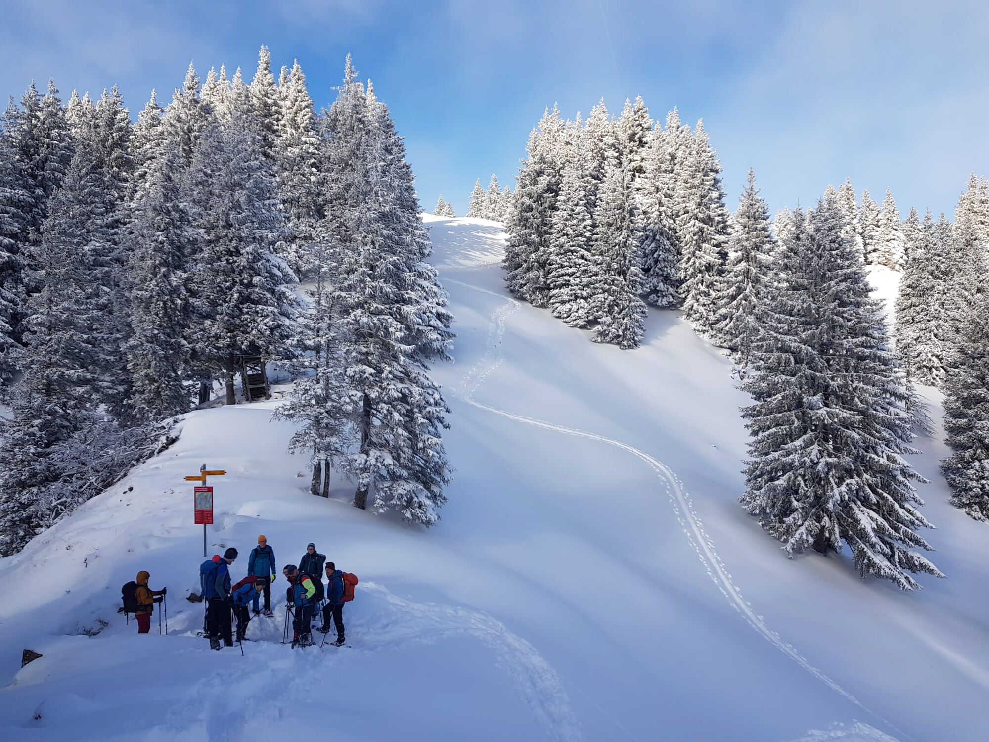 Eine stattliche Gruppe machte sich am Sonntagfrüh auf den Weg nach Langis auf. Wie oft war der Zug ab Luzern Richtung Sarnen gut besetzt. Auch im Postauto waren wir nicht alleine. Bei nebligem und kühlen Wetter machten wir uns zum Abstieg zur Ochsenalp auf, um dann via Münchenboden zum Mettlenbüel aufzusteigen. Vor uns waren einige Skitourenläufer unterwegs, welche im Neuschnee eine praktische Spur legten. Trotzdem kam es im letzten Abschnitt immer wieder zu Einbrüchen im weichen Untergrund. Unterdessen zeigte sich zeitweise die Sonne, zum guten Glück auch während der Mittagsrast auf dem Selispitz. Zurück im Mettlenbüel zielte die Route Richtung Riedmattstock. Kein beliebtes Ziel für Skitourengänger. So war keine Spur in diese Richtung gelegt. Also mussten wir uns selber durch den teilweise ein Meter tiefen Neuschnee kämpfen. Kein Wunder handelten wir uns so einen Rückstand auf die Marschtabelle ein. So entschlossen wir uns, beim Gipfelkreuz des Riedmattstocks umzukehren und auf demselben Weg Richtung Startpunkt zurück zu marschieren und auf die Umrundung des Schiessplatzes zu verzichten. Der Abstieg zur Ochsenalp machte im weichen Neuschnee richtig Spass. Zurück im Langis hatten wir genügend Zeit, um ein Zvieri im Restaurant zu geniessen, bevor wir uns mit Postauto und Zug auf den Heimweg machten.