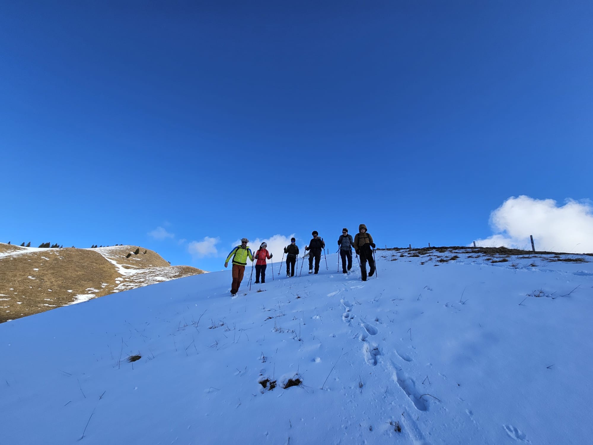 Unsere sechsköpfige Gruppe plus Tourenleiter traf sich pünktlich um 8.30 Uhr in Euthal SZ. Altersmässig bunt gemischt – von jung bis jung geblieben – und von Beginn weg mit guter Laune im Rucksack. Die Bedingungen machten schnell klar: Schneeschuhe durften zuhause bleiben, stattdessen setzten wir auf Bergschuhe mit Spikes. Eine weise Entscheidung, wie sich bald zeigen sollte.