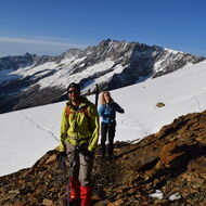 Die Aussicht mit dem 360 ° Panorama von der Bernina über Alpstein, die Innerschweizer-, Berner -, Walliser - zu den Tessiner Alpen ist phänomenal. Nachdem wir uns satt gesehen und wir von Thomas‘ umfassenden Geographiekenntnissen profitiert hatten, begann der gemütliche Abstieg zur Tierberglihütte. Aufgrund der Spaltenzonen war ein direkter Abstieg vom Sustenhorn Richtung Hütte wie in den letzten Jahren nicht möglich. Es musste gegen die Sustenlimi im Bogen zur oberen Spaltenzone ausgeholt werden. Kurz vor 13 Uhr waren wir an der Tierberglihütte. Schließlich folgte noch der gut zweieinhalb- bis dreistündige Abstieg zum Hotel Steingletscher. Es blieb bis zur Abfahrt des Postautos genügend Zeit für eine ausgiebige Stärkung.